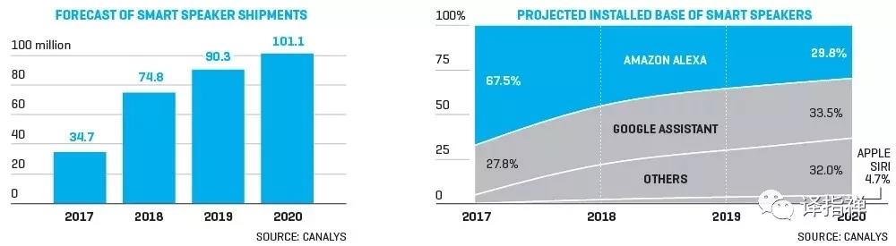 賭注如此之高,競爭激烈也不足為奇。 根據(jù)研究公司Canalys的數(shù)據(jù)顯示,亞馬遜最早進(jìn)入市場并處于領(lǐng)先,在全球連接音箱市場占據(jù)42%的份額。